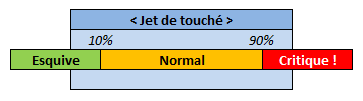 Lors d'une attaque physique, un jet de touche est réalisé (de 1 à 100), le résultat est comparé à deux seuils :