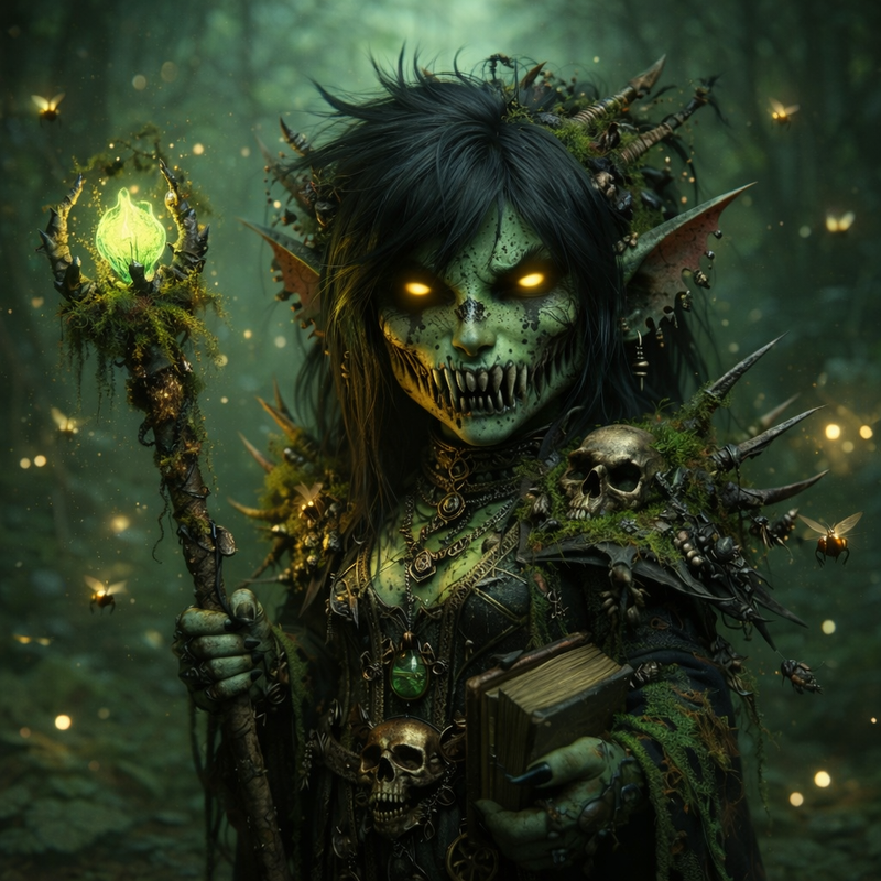 Nécromancienne, elle se drape dans des vêtements d’apparence archaïque, dignes des plus anciens sorciers. Son habit noir et vert est orné de crânes de petites créatures, de racines et de mousse, symbolisant son rôle de gardienne du cycle de la vie et de la mort. À sa ceinture, pendent un grimoire écorné et des fioles contenant des liquides mystérieux. Dans sa main, elle brandit un sceptre sculpté dans un os massif, incrusté de gemmes phosphorescentes. Sur sa poitrine, des tatouages anciens se révèlent sous la lumière de la lune, racontant une histoire de pouvoir et de corruption. Autour d’elle, des insectes tournent en une danse sinistre, tandis que des lucioles illuminent ses pas.